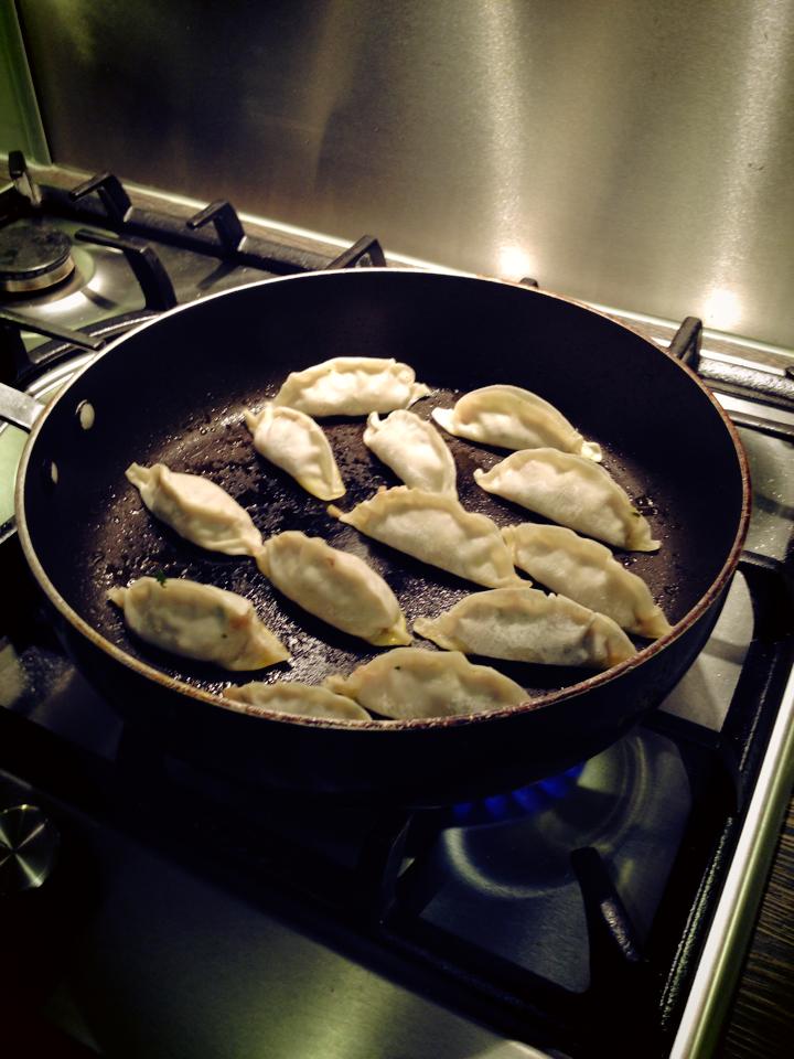 Heat a little oil in a frying pan – I use olive oil spray and add the dumplings to the pan but not too many at a time.( I did these in 2 batches) Fry gently until the bottom of the dumplings until they can lift from the pan.