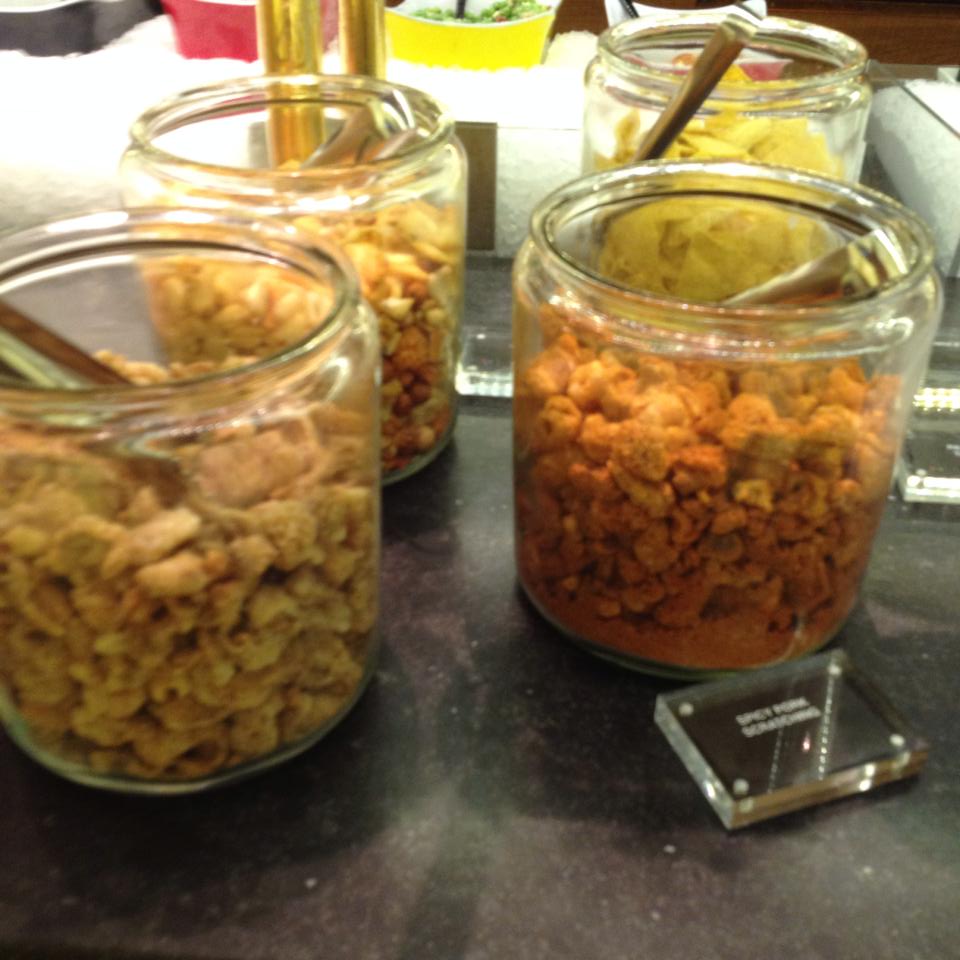 The things I can remember are, Sushi, anchovies, salami, paremsan cheese, bowls of pork scratchings, regular and spicy, an array of dressing oils, dipping sauces, salsas, guacamole, all your standard salad items, good quality olives in oil, a large bowl full of parmesan cheese, a cheeseboard, nuts and seeds for toppings, giant cous cous salad, sundried tomatoes, orzo pasta.. but there was so much more.