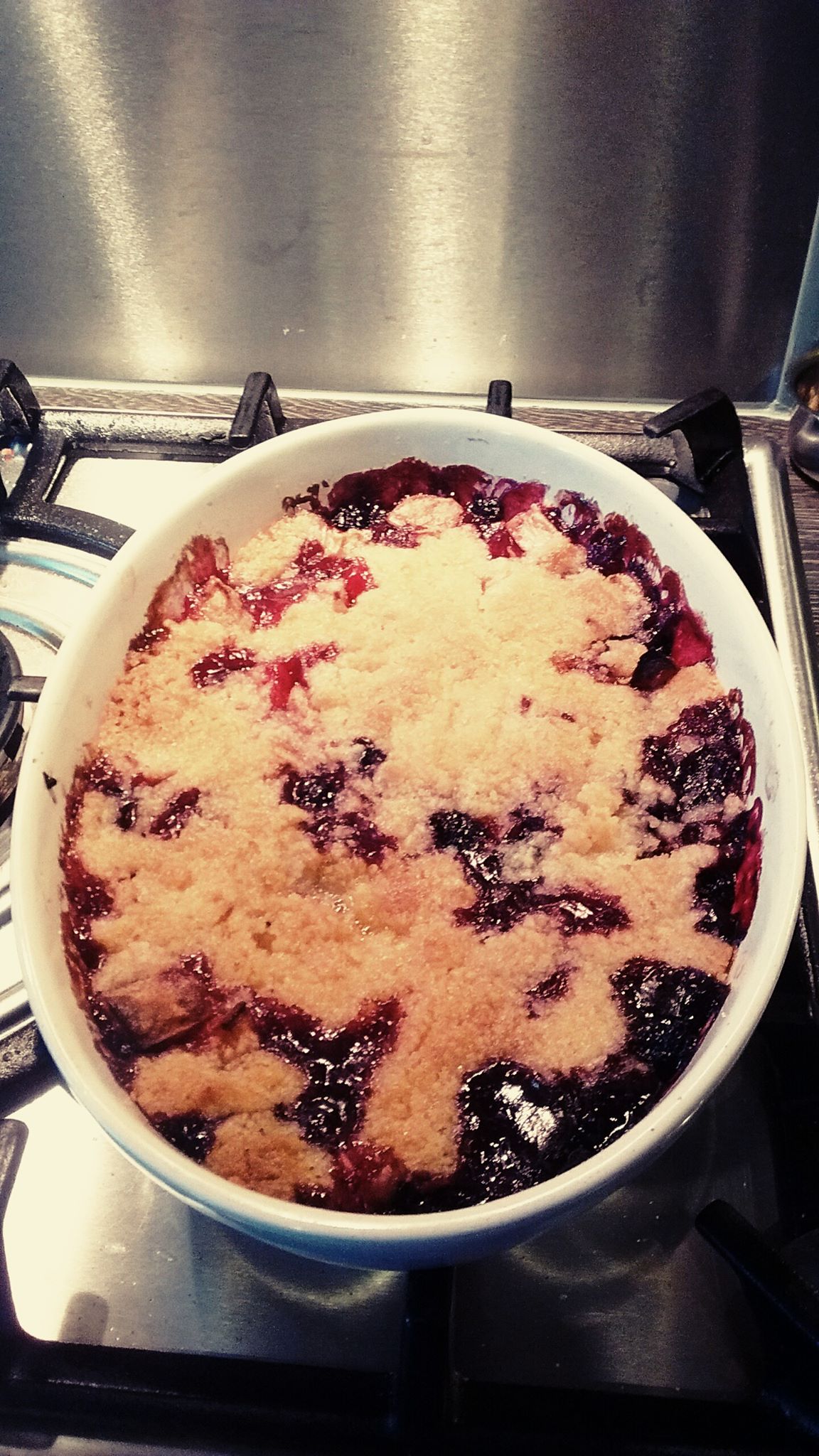 Add the mixed topping onto the fruit and bake in the oven around 180 degrees (fan) for around 20 minutes or until it looks done. The topping should go hard like lumps of buttery biscuit! If it is not hard, cool it in the fridge first then reheat.